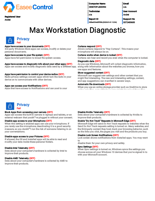 Complete checking of the information about you that is shared by the Windows operating system and the installed applications, including the browsers, analyzing what is shared, who is shared with and if that information is used to track your computer activity or Internet access. You will be noticed regarding Tailored Advertisement, User Activity Tracking Fail, Personal Life & Data Protection and your Account Security.