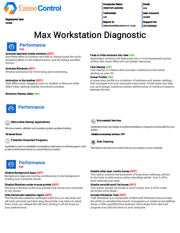 Deep dive on your system software fine tuning options in order to make sure that you are getting the last drop of performance from your workstation. Check out the Removable Startup Applications, Potential Unwanted Programs, Not Necessary Service or Disk Cleaning Ability Percentage and maximize your computer speed.