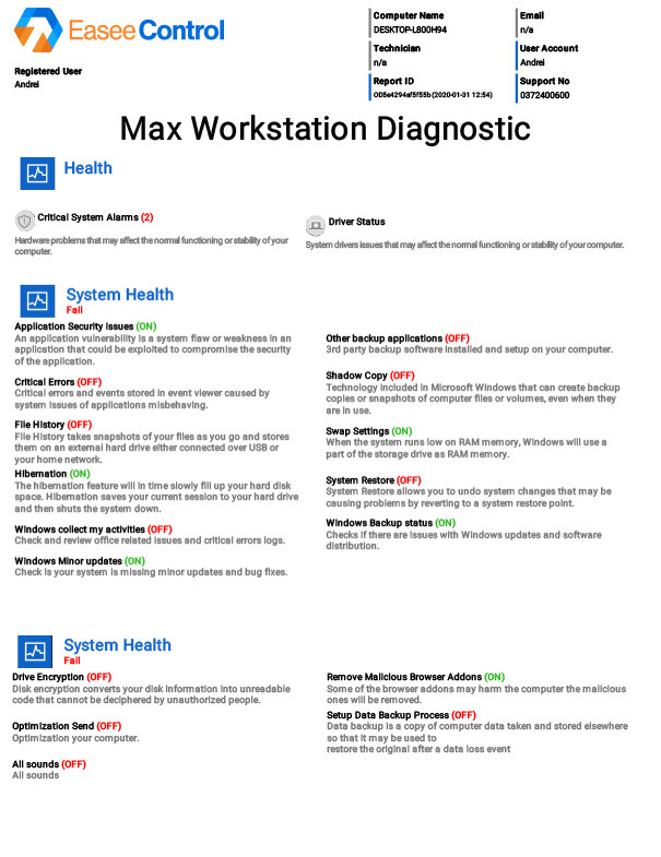 It will also deliver a detailed report regarding Critical System Alarms, Major System Alarms, Drivers Status or Registry.